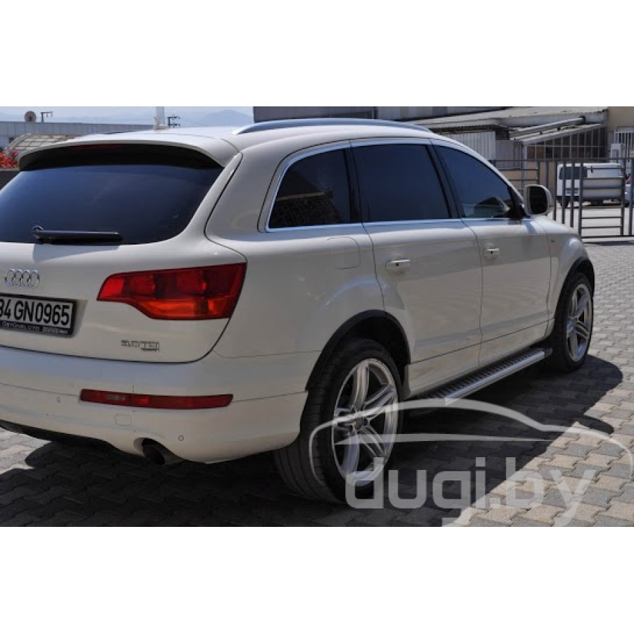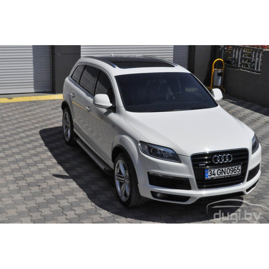 Боковые алюминиевые пороги (подножки) "SAPPHIRE" с пластмассовыми накладками для AUDI Q7 (2006-...) предназначены для защиты боковых повреждений, а также для удобства посадки и высадки пасажиров в Audi Q7.