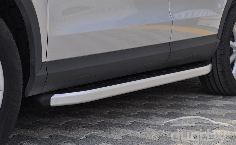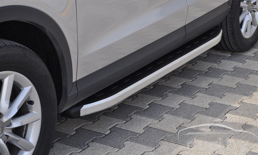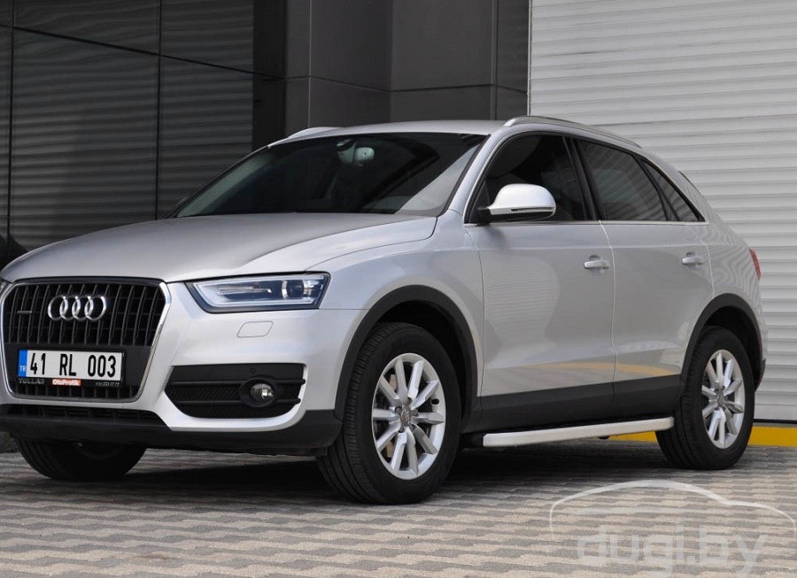 Боковые алюминиевые подножки (пороги) с пластмассовой накладкой для Audi Q3 предназначены для защиты боковых повреждений автомобиля, а также для удобства посадки и высадки пассажиров.
