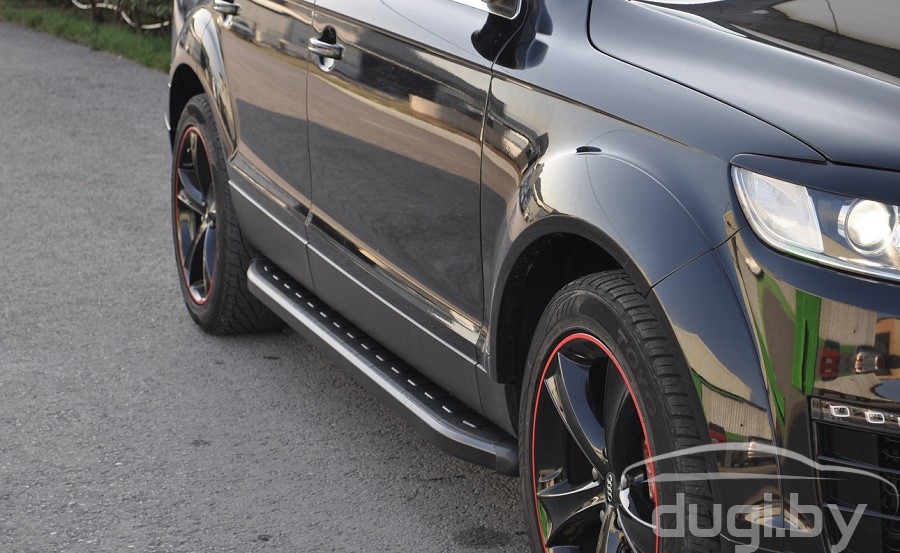 Боковые алюминиевые подножки (пороги) с пластмассовой накладкой для Audi Q7 предназначены для защиты боковых повреждений автомобиля, а также для удобства посадки и высадки пассажиров.