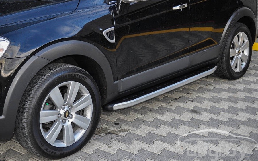 Защита боковых порогов состоит из алюминиевого профиля и боковой панели из алюминия покрытой матовым напылением. С двух сторон подножки закрыты торцевыми пластиками из ABS. Верхняя часть порога (подножки) изготовлена из высококачественного ABS пластика. Износоустойчива к различным климатическим условиям. Подножки отлично вписываются в аэродинамический внешний вид и дополняют оригинальный дизайн Вашего Chevrolet Captiva.