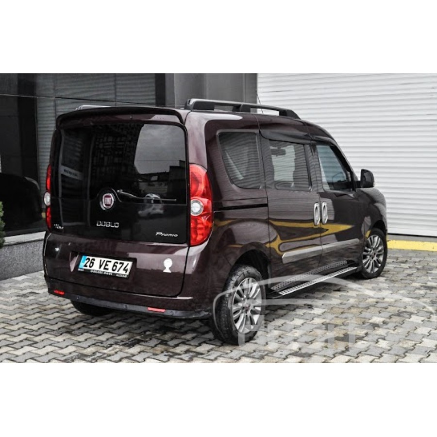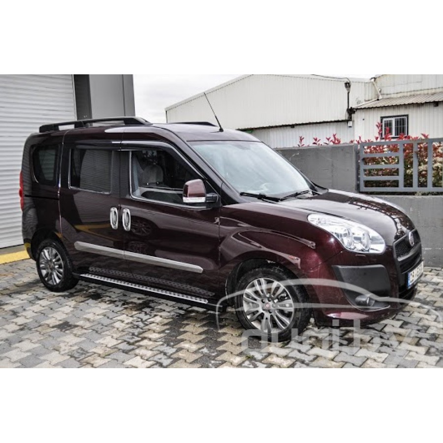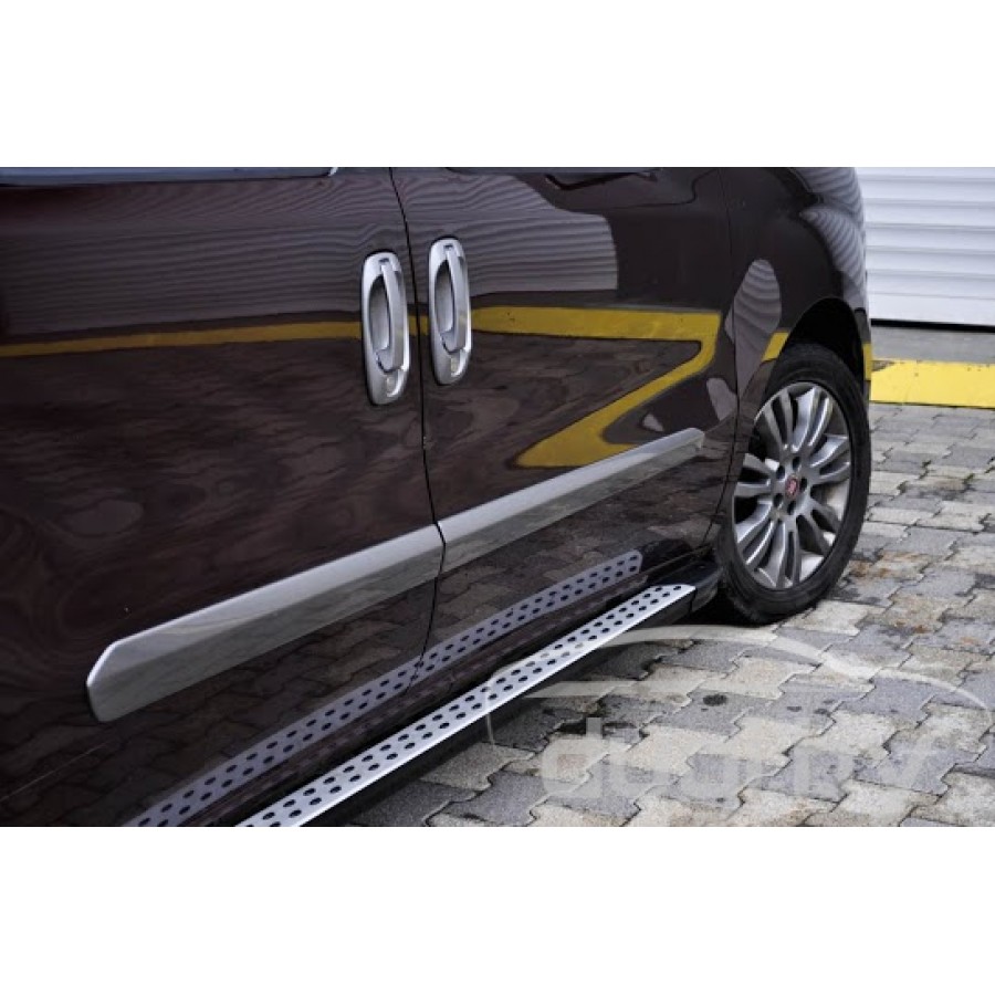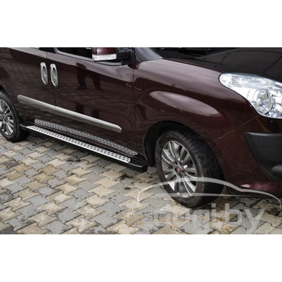 Боковые алюминиевые подножки (пороги) для Fiat Doblo предназначены для защиты боковых повреждений автомобиля, а также для удобства посадки и высадки пассажиров.