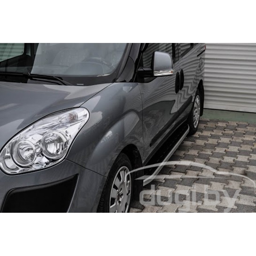 Боковые алюминиевые подножки (пороги) с пластмассовой накладкой для Fiat Doblo предназначены для защиты боковых повреждений автомобиля, а также для удобства посадки и высадки пассажиров.