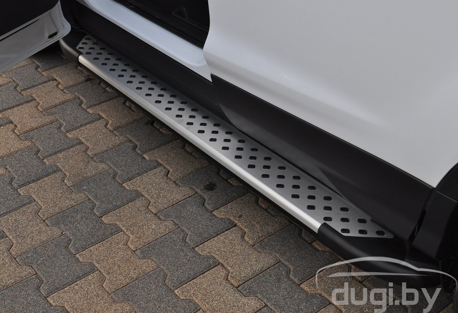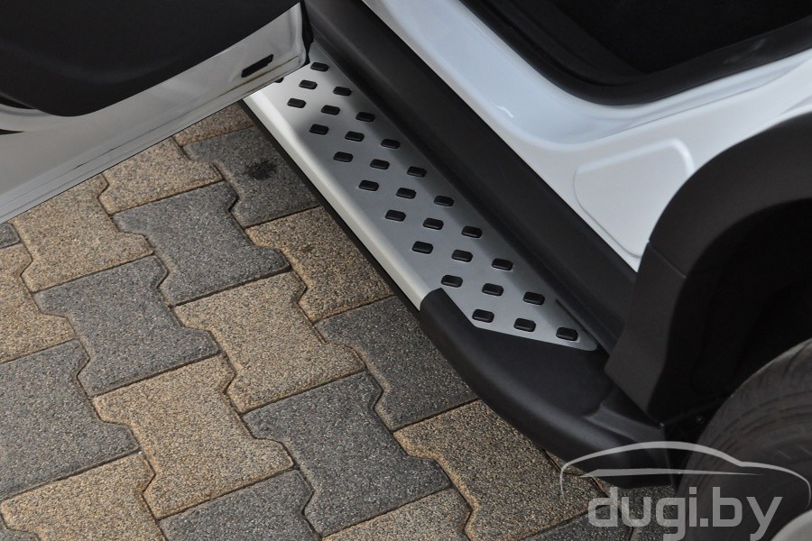 Площадки изготовлены из высококачественного алюминия толщина которого 5см и имеют специальный рельеф противоскольжения по всей поверхности порогов. Подножки просты в установке и не требуют сверления и сварки, в комплекте порогов присутствует схема установки и монтажный комплект креплений.