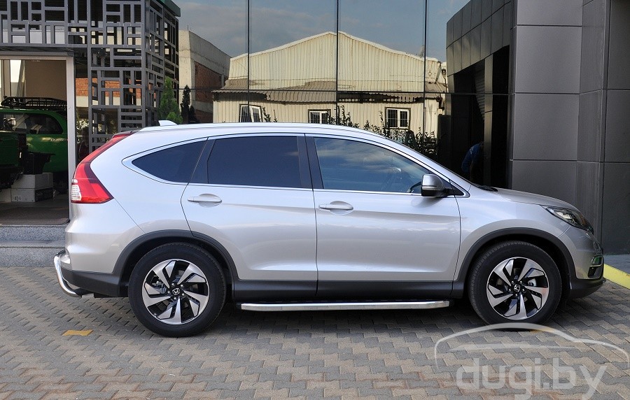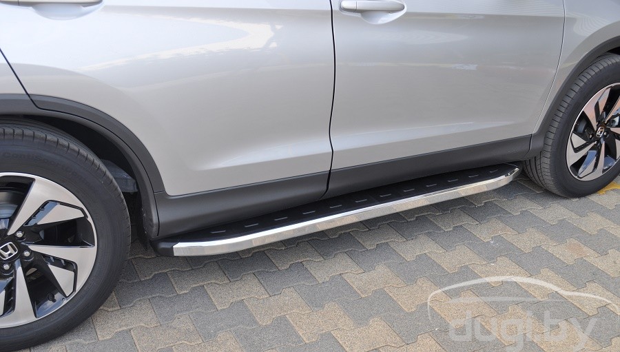 Защита боковых порогов состоит из алюминиевого профиля и боковой панели из алюминия покрытой хромовым напылением. С двух сторон подножки закрыты торцевыми пластиками из ABS. Верхняя часть порога (подножки) изготовлена из высококачественного ABS пластика. Износоустойчива к различным климатическим условиям. Подножки отлично вписываются в аэродинамический внешний вид и дополняют оригинальный дизайн Вашего Honda CR-V.
