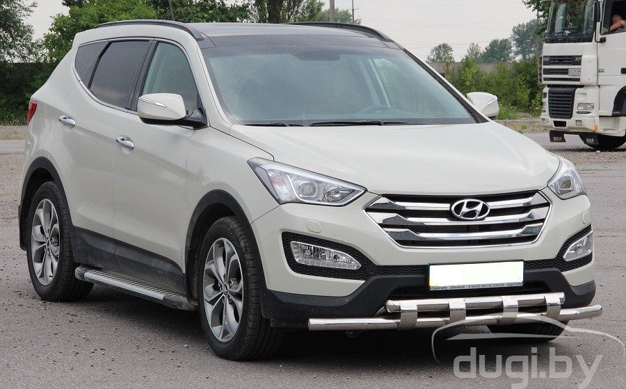 Защита переднего бампера труба двойная для Hyundai Santa Fe предназначен для защиты кузова автомобиля при езде по пересеченной местности, а также от различного рода столкновений.