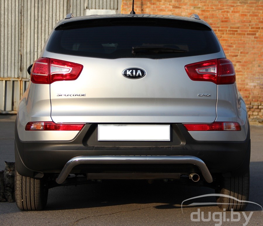 Защита заднего бампера труба для Kia Sportage предназначена для защиты кузова автомобиля при езде по пересеченной местности, а также от различного рода столкновений.