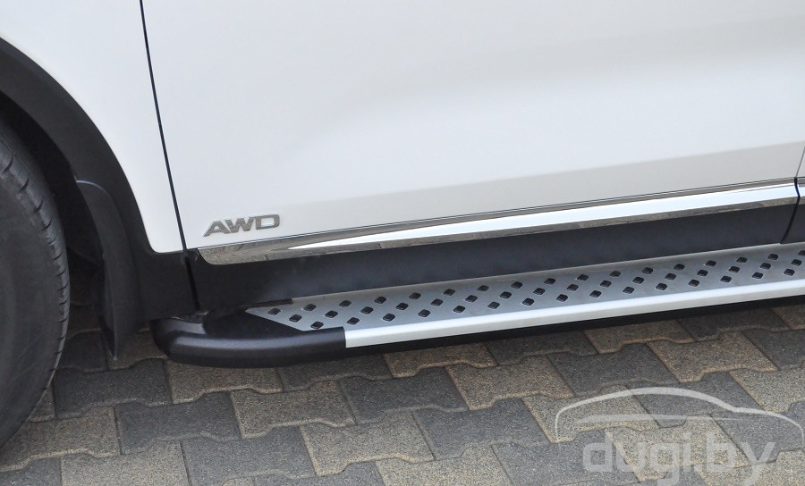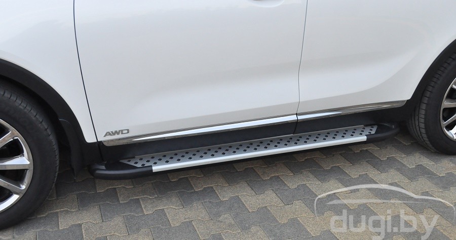 Боковые алюминиевые подножки (пороги) с пластмассовой накладкой для KIA SORENTO предназначены для защиты боковых повреждений автомобиля, а также для удобства посадки и высадки пассажиров.