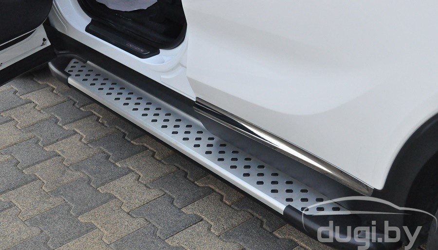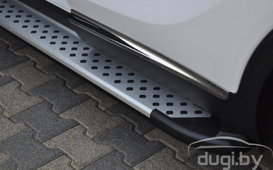 Площадки изготовлены из высококачественного алюминия толщина которого 5см и имеют специальный рельеф противоскольжения по всей поверхности порогов. Подножки просты в установке и не требуют сверления и сварки, в комплекте порогов присутствует схема установки и монтажный комплект креплений.