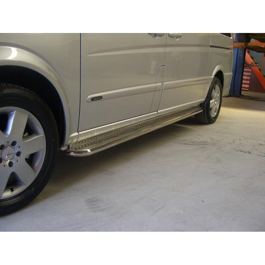 Боковые пороги (площадки) из нержавеющей стали для Mercedes-Benz Viano предназначены для защиты боковых повреждений, а также для удобства посадки и высадки пасажиров в Viano.