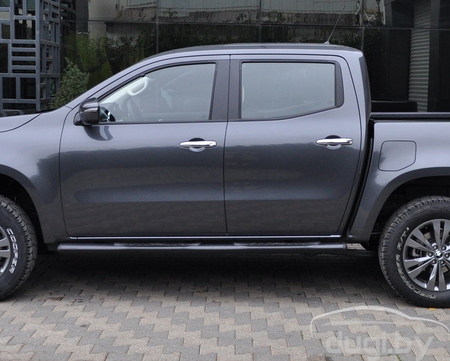 Боковые подножки для Mercedes-Benz X-Class предназначены для защиты боковых повреждений автомобиля, а также для удобства посадки и высадки пассажиров.