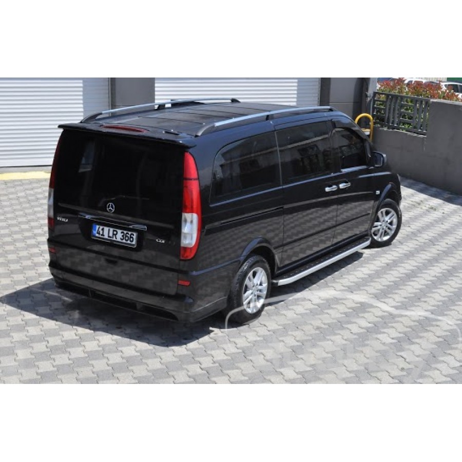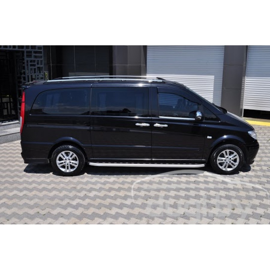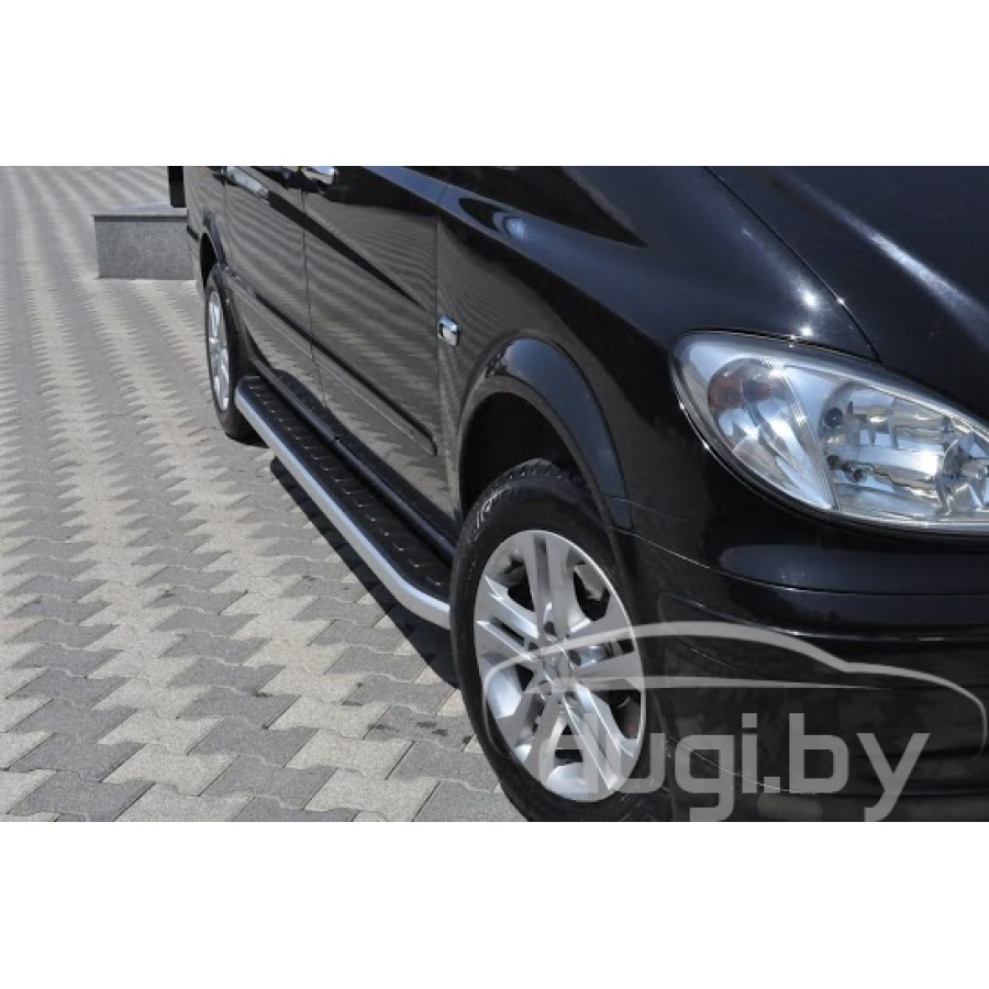 Боковые алюминиевые подножки - пороги с пластмассовой накладкой для Mercedes Viano предназначены для защиты боковых повреждений автомобиля, а также для удобства посадки и высадки пассажиров.