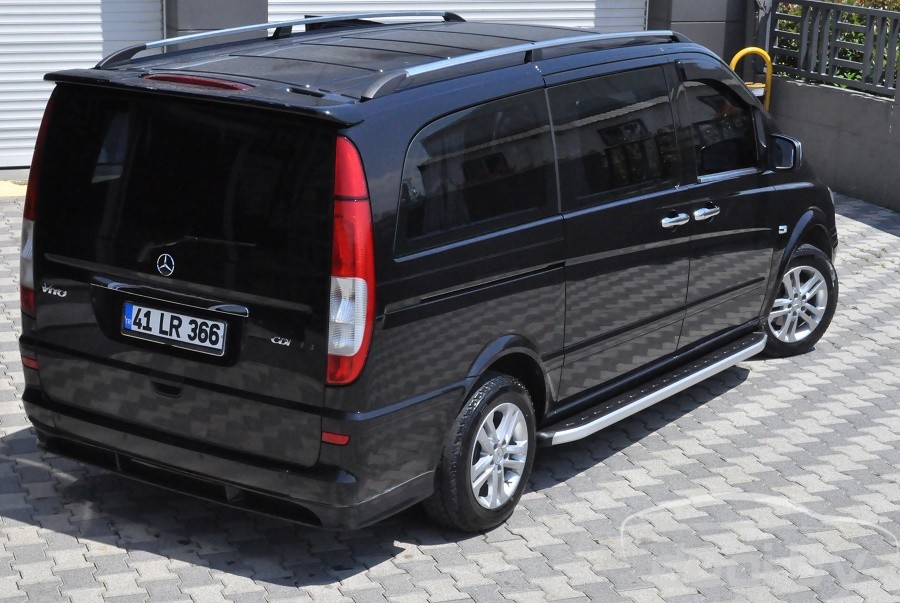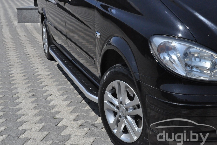Защита боковых порогов состоит из алюминиевого профиля и боковой панели из алюминия покрытой матовым напылением. С двух сторон подножки закрыты торцевыми пластиками из ABS. Верхняя часть порога (подножки) изготовлена из высококачественного ABS пластика. Износоустойчива к различным климатическим условиям. Подножки отлично вписываются в аэродинамический внешний вид и дополняют оригинальный дизайн Вашего Mercedes Vito\Viano.