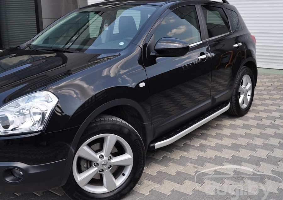 Боковые алюминиевые подножки (пороги) с пластмассовой накладкой для Nissan Qashqai предназначены для защиты боковых повреждений автомобиля, а также для удобства посадки и высадки пассажиров в Nissan Qashqai.