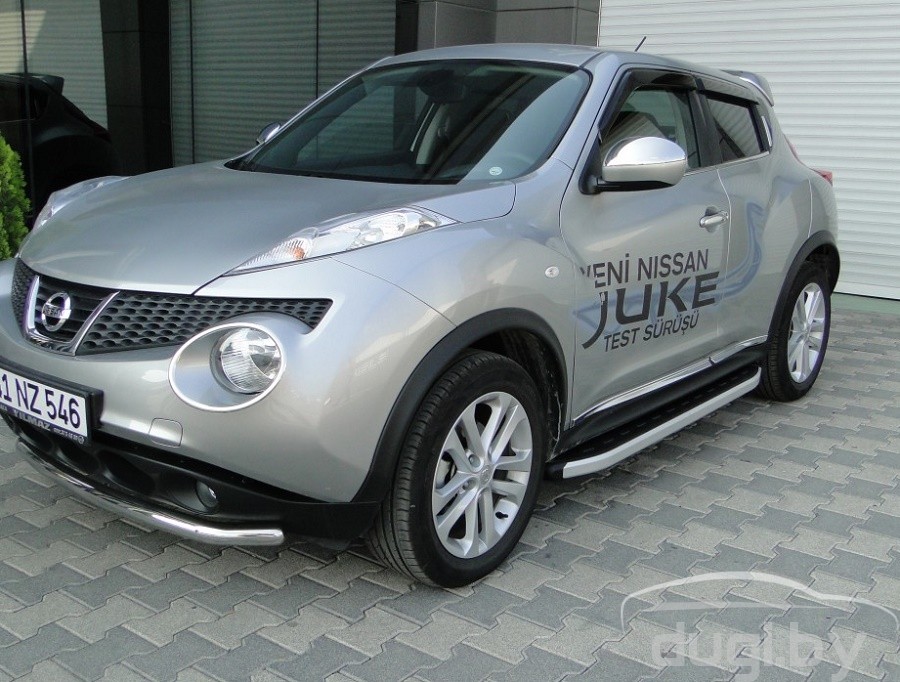 Защита боковых порогов состоит из алюминиевого профиля и боковой панели из алюминия покрытой матовым напылением. С двух сторон подножки закрыты торцевыми пластиками из ABS. Верхняя часть порога (подножки) изготовлена из высококачественного ABS пластика. Износоустойчива к различным климатическим условиям. Подножки отлично вписываются в аэродинамический внешний вид и дополняют оригинальный дизайн Вашего Nissan Juke.