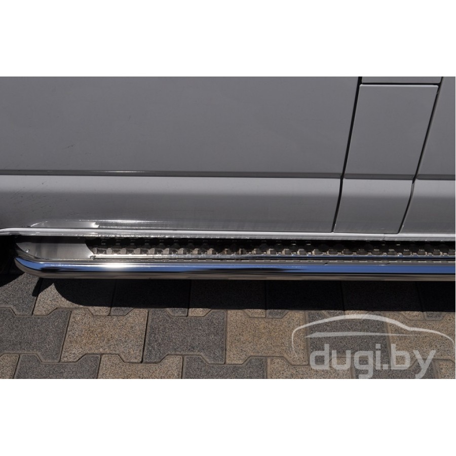 Площадки изготовлены из высококачественной нержавеющей стали марки AISI 304 и имеют специальный рельеф противоскольжения по всей поверхности порогов. Площадки (ступеньки) просты в установке и не требуют вмешательства в конструкцию автомобиля. В комплекте боковых площадок присутствует схема установки и монтажный комплект крепления..