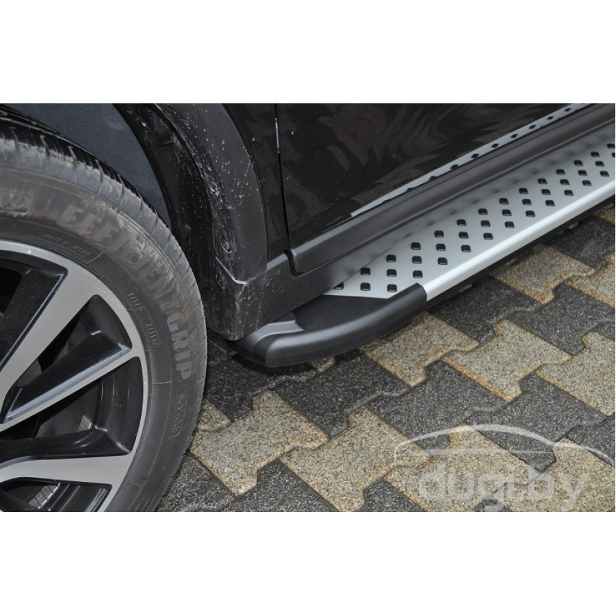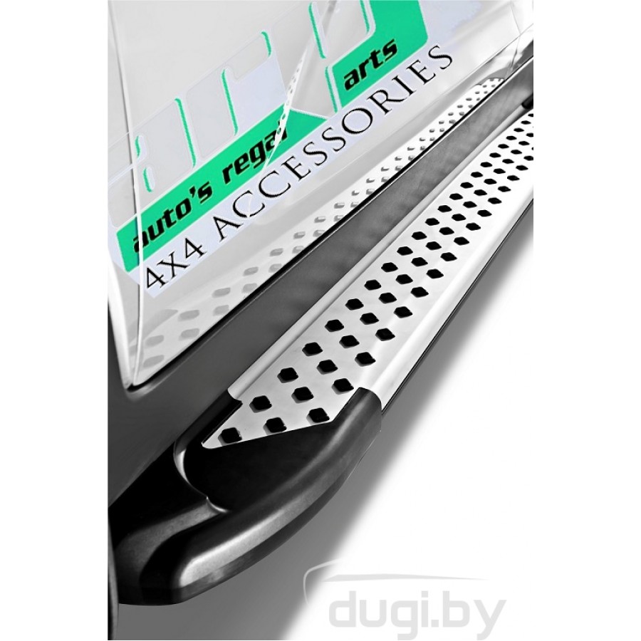 Площадки изготовлены из высококачественного алюминия толщина которого 5см и имеют специальный рельеф противоскольжения по всей поверхности порогов. Подножки просты в установке и не требуют сверления и сварки, в комплекте порогов присутствует схема установки и монтажный комплект креплений.