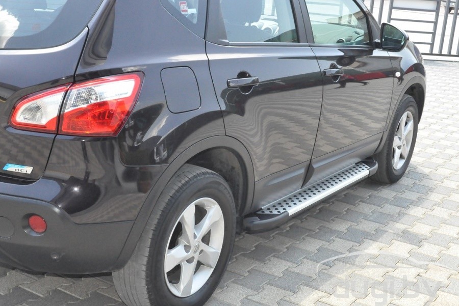 Боковые алюминиевые подножки (пороги) с пластмассовой накладкой для Nissan Qashqai предназначены для защиты боковых повреждений автомобиля, а также для удобства посадки и высадки пассажиров в Nissan Qashqai.