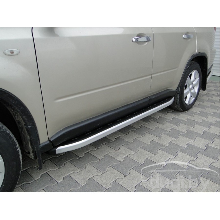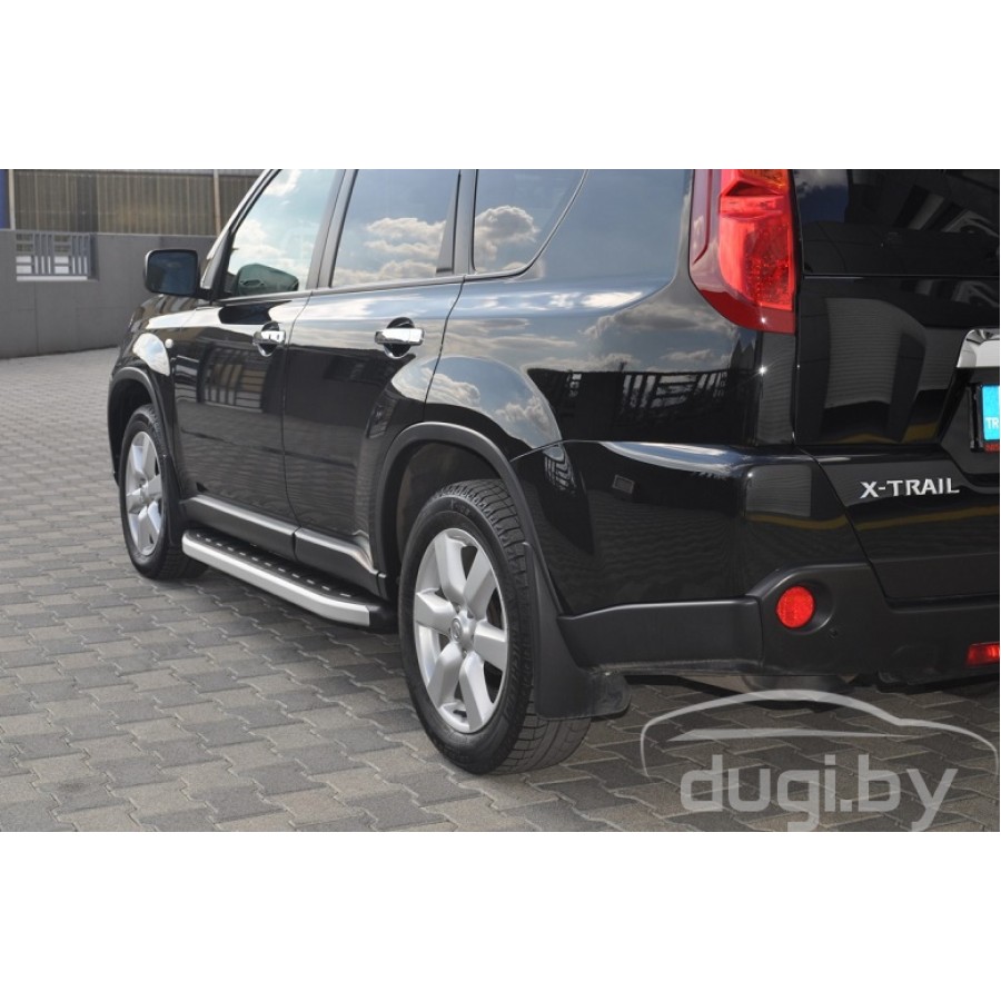 Боковые алюминиевые подножки (пороги) с пластмассовой накладкой для Nissan X-Trail предназначены для защиты боковых повреждений автомобиля, а также для удобства посадки и высадки пассажиров в Nissan X-Trail.