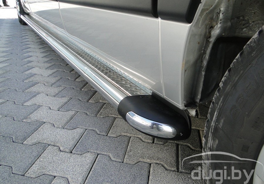Боковые пороги (площадки) из нержавеющей стали для Opel Movano предназначены для защиты боковых повреждений, а также для удобства посадки и высадки пасажиров.