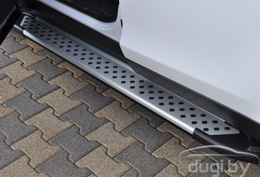 Площадки изготовлены из высококачественного алюминия толщина которого 5см и имеют специальный рельеф противоскольжения по всей поверхности порогов. Подножки просты в установке и не требуют сверления и сварки, в комплекте порогов присутствует схема установки и монтажный комплект креплений.