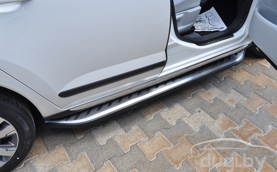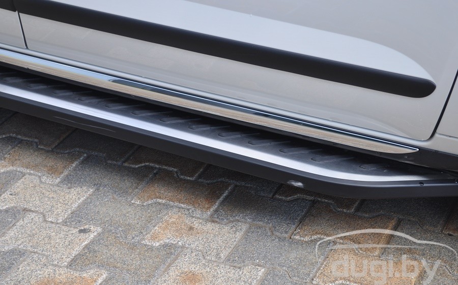 Пороги изготовлены из высококачественного алюминия толщина которого 5 см и имеют специальный рельеф противоскольжения по всей поверхности порогов. Подножки просты в установке и не требуют сверления и сварки, в комплекте порогов присутствует схема установки и монтажный комплект креплений.
