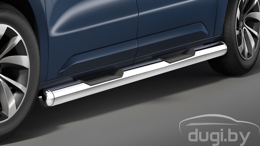 Боковые подножки трубы с проступями для Peugeot Traveller предназначены для защиты боковых повреждений автомобиля, а также для удобства посадки и высадки пассажиров. Просты в установке и не требуют вмешательства в конструкцию автомобиля, в комплекте присутствует схема установки и монтажный комплект креплений.