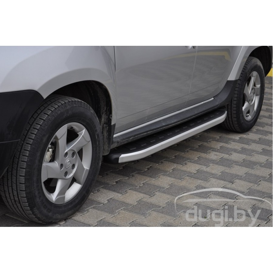 Боковые алюминиевые подножки (пороги) с пластмассовой накладкой для Renault Duster предназначены для защиты боковых повреждений автомобиля, а также для удобства посадки и высадки пассажиров.
