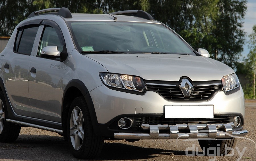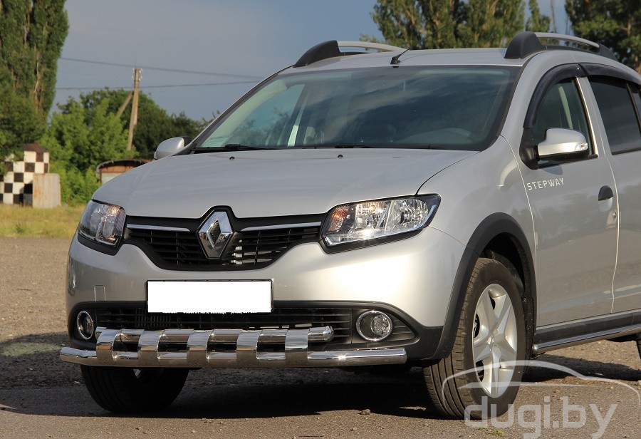 Защита переднего бампера труба двойная для Renault Sandero Stepway предназначен для защиты кузова автомобиля при езде по пересеченной местности, а также от различного рода столкновений.