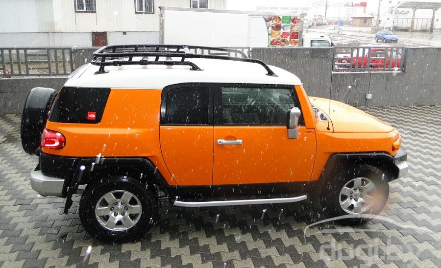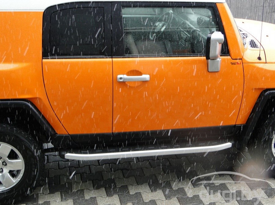Защита боковых порогов состоит из алюминиевого профиля и боковой панели из алюминия покрытой матовым напылением. С двух сторон подножки закрыты торцевыми пластиками из ABS. Верхняя часть порога (подножки) изготовлена из высококачественного ABS пластика. Износоустойчива к различным климатическим условиям. Подножки отлично вписываются в аэродинамический внешний вид и дополняют оригинальный дизайн Вашего Toyota FJ Cruiser.