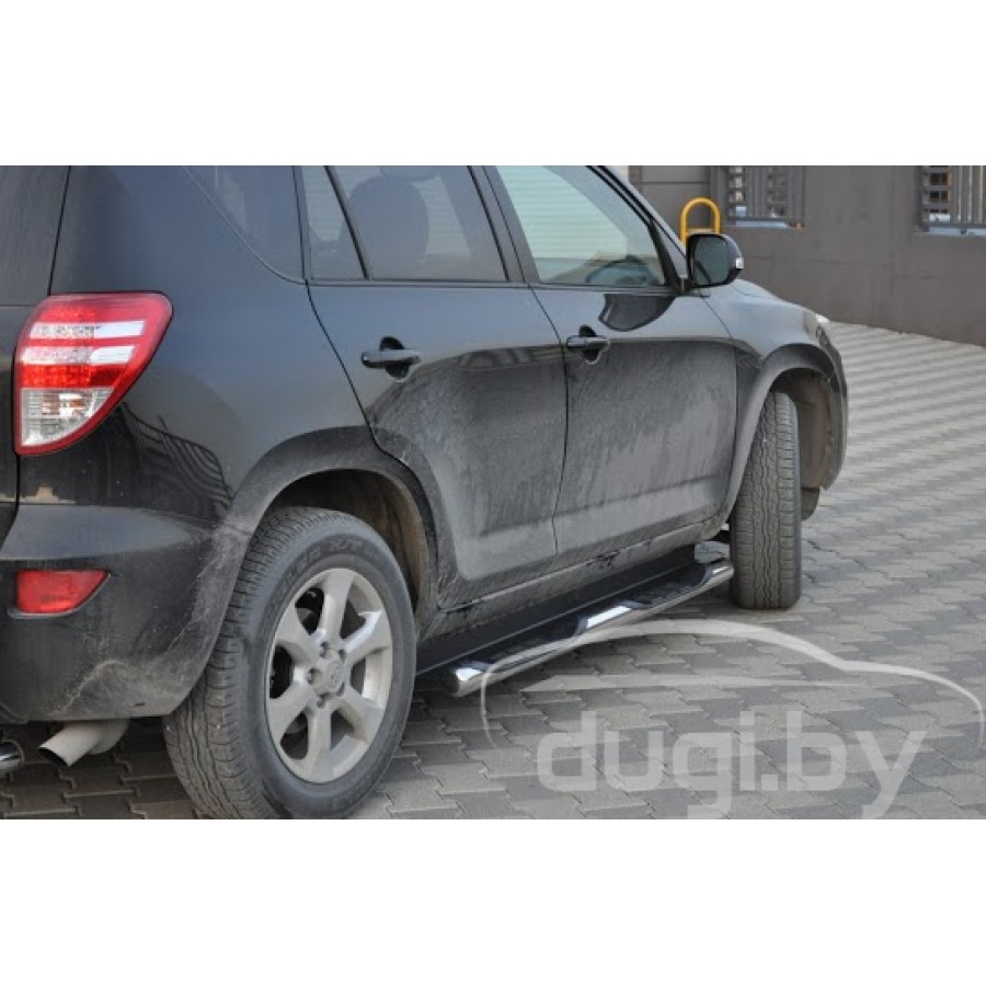 Боковые подножки (трубы) для Toyota RAV4 предназначены для защиты боковых повреждений автомобиля, а также для удобства посадки и высадки пассажиров.