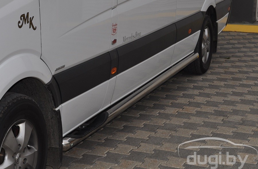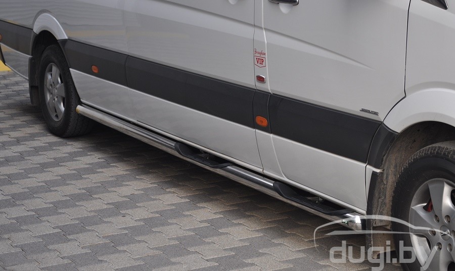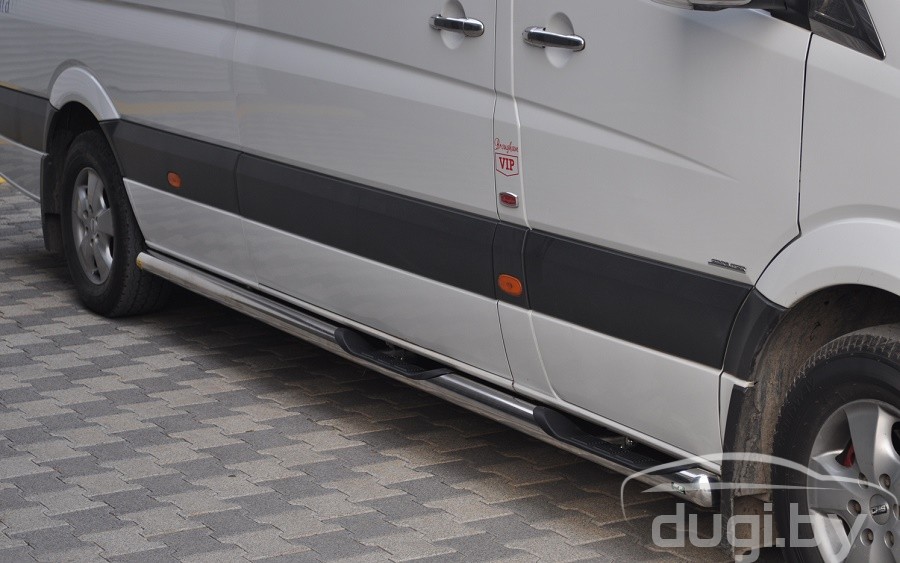 Боковые подножки трубы для Volkswagen Crafter предназначены для защиты боковых повреждений автомобиля, а также для удобства посадки и высадки пассажиров.