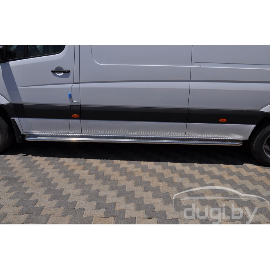 Боковые подножки (площадки) из нержавеющей стали для Volkswagen Crafter предназначены для защиты боковых повреждений, а также для удобства посадки и высадки пасажиров.