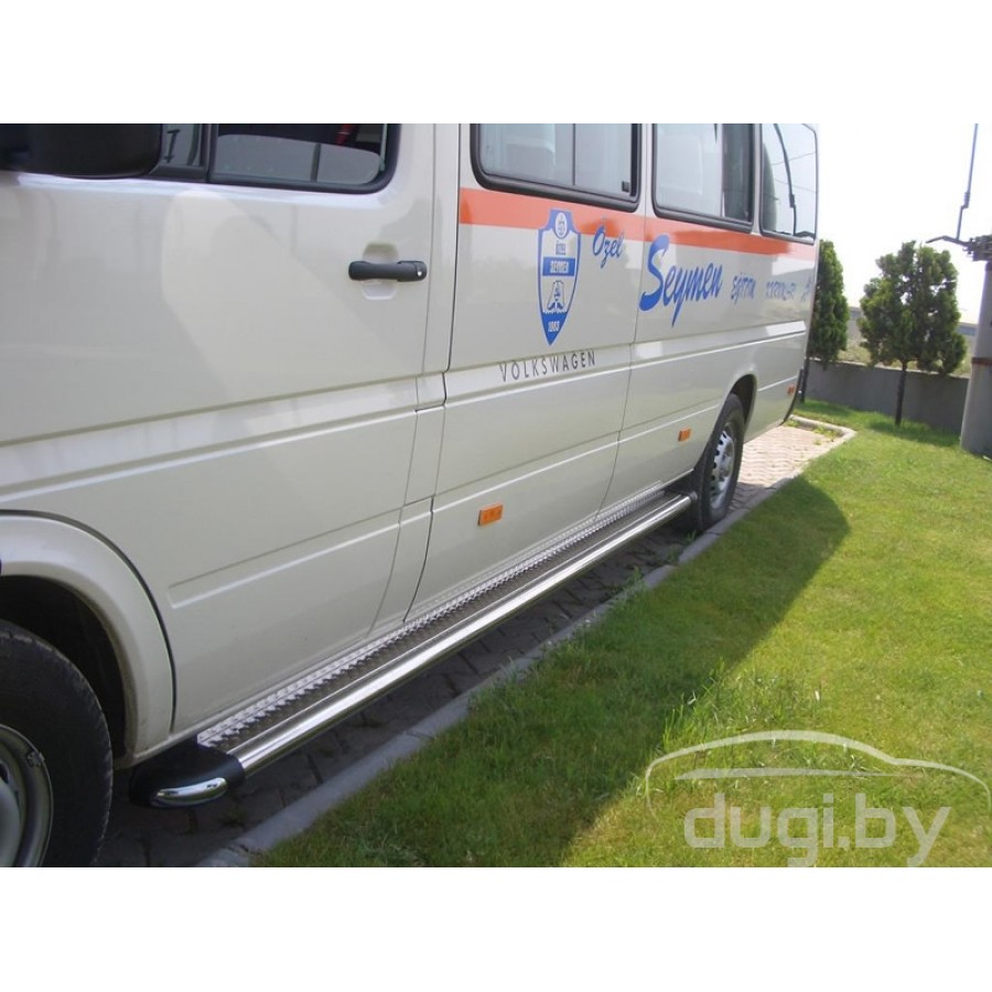 Боковые пороги (площадки) из нержавеющей стали для Volkswagen LT предназначены для защиты боковых повреждений, а также для удобства посадки и высадки пасажиров.