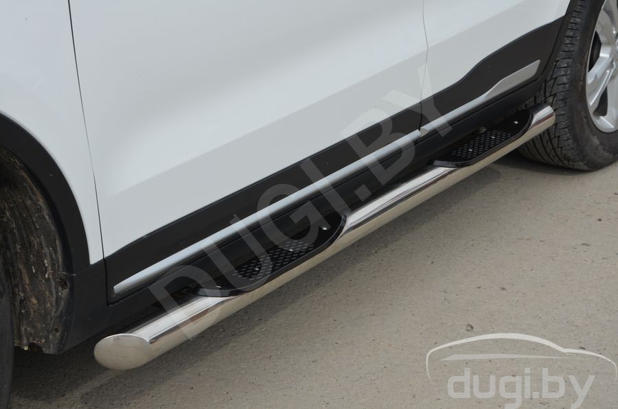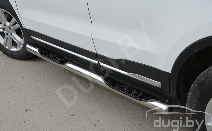 Боковые подножки трубы DELUX D76 для Geely Atlas с 2016-н.в. от эксклюзивного производителя автотюнинга i-Tuning из нержавеющей стали марки AISI 304, предназначены для защиты от боковых повреждений автомобиля, а также для удобства посадки и высадки пассажиров.