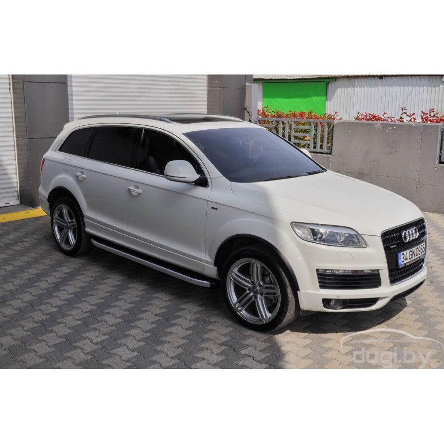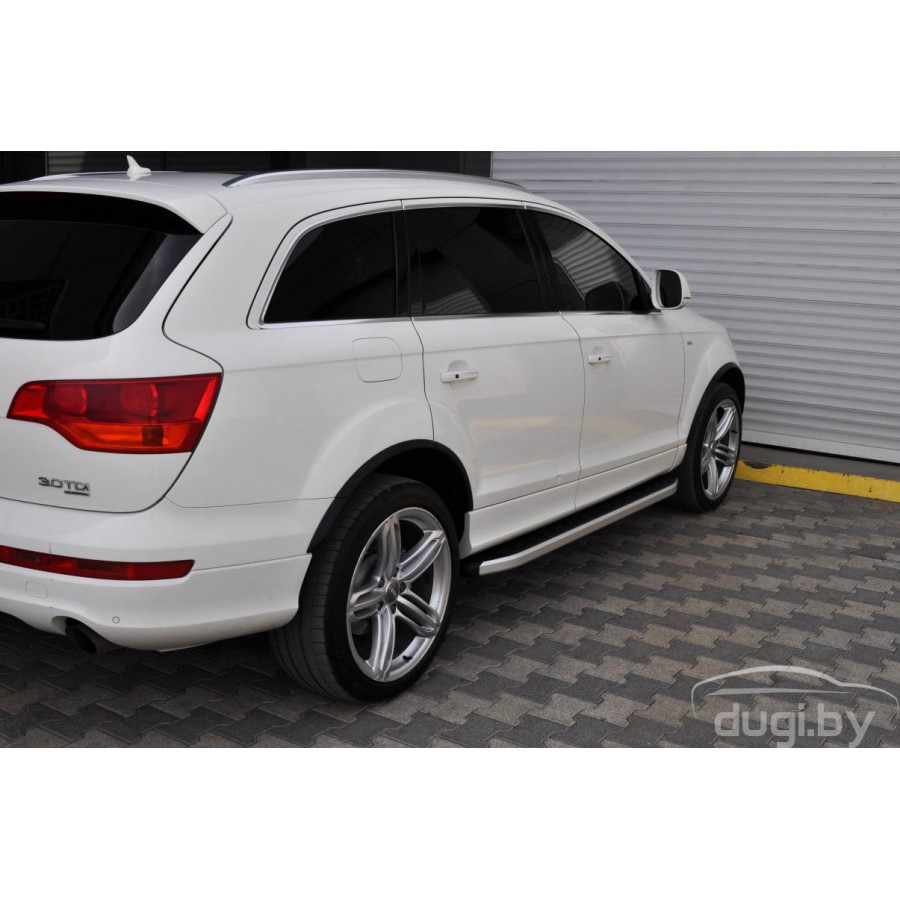 Боковые алюминиевые подножки (пороги) "ALYANS" с пластмассовой накладкой для AUDI Q7 (2006-...) предназначены для защиты боковых повреждений автомобиля, а также для удобства посадки и высадки пассажиров в Audi Q7.