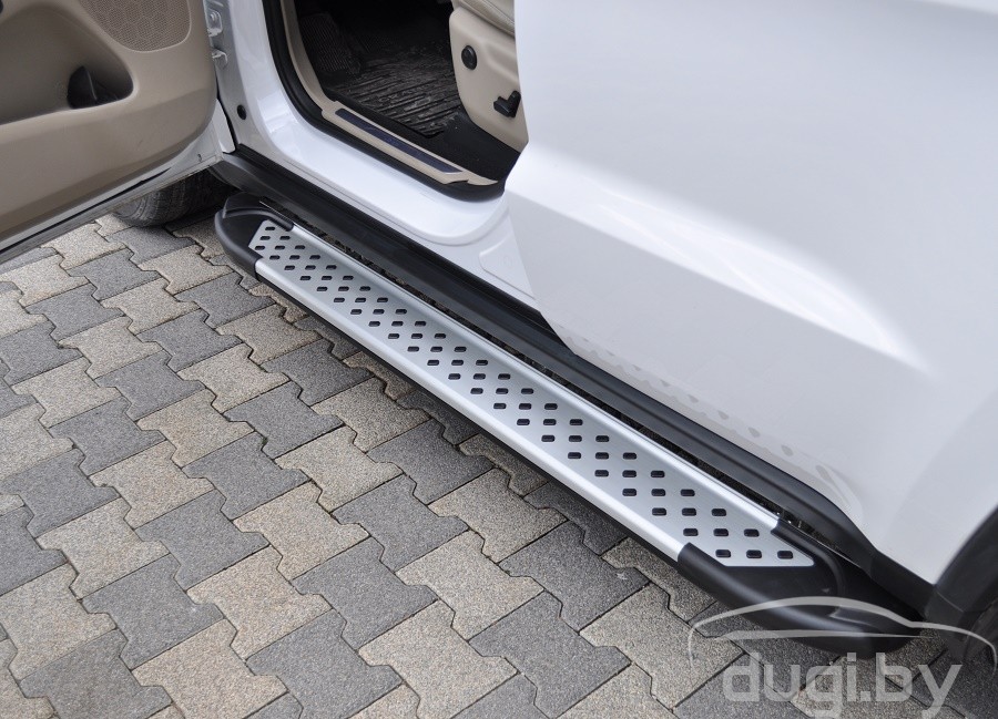 Площадки изготовлены из высококачественного алюминия толщина которого 5см и имеют специальный рельеф противоскольжения по всей поверхности порогов. Подножки просты в установке и не требуют сверления и сварки, в комплекте порогов присутствует схема установки и монтажный комплект креплений.