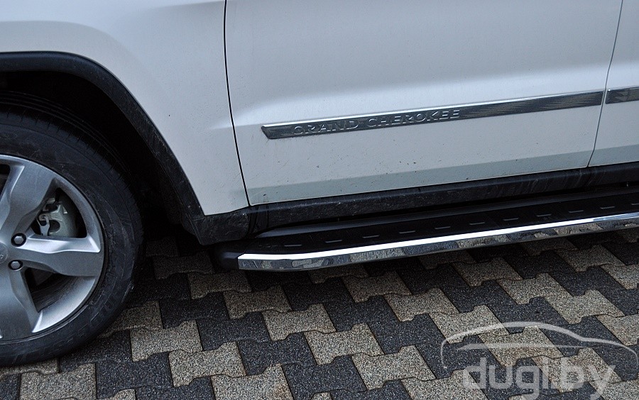 Защита боковых порогов состоит из алюминиевого профиля и боковой панели из алюминия покрытой хромовым напылением. С двух сторон подножки закрыты торцевыми пластиками из ABS. Верхняя часть порога (подножки) изготовлена из высококачественного ABS пластика. Износоустойчива к различным климатическим условиям. Подножки отлично вписываются в аэродинамический внешний вид и дополняют оригинальный дизайн Вашего Jeep Grand Cherokee.