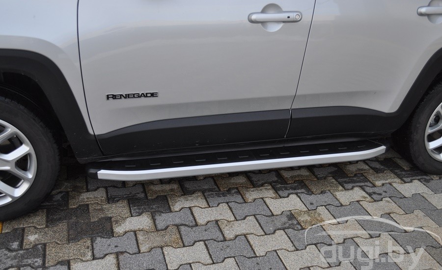 Защита боковых порогов состоит из алюминиевого профиля и боковой панели из алюминия покрытой матовым напылением. С двух сторон подножки закрыты торцевыми пластиками из ABS. Верхняя часть порога (подножки) изготовлена из высококачественного ABS пластика. Износоустойчива к различным климатическим условиям. Подножки отлично вписываются в аэродинамический внешний вид и дополняют оригинальный дизайн Вашего Jeep Renegade.